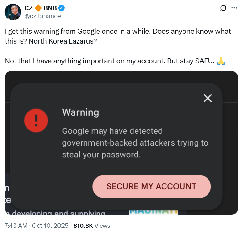 “Я отримую це попередження від Google раз у раз. Хтось знає, що це? Північна Корея Лазар? Не те, що у мене є щось важливе на своєму обліковому записі”, – сказав Чжао у п’ятницькій публікації.