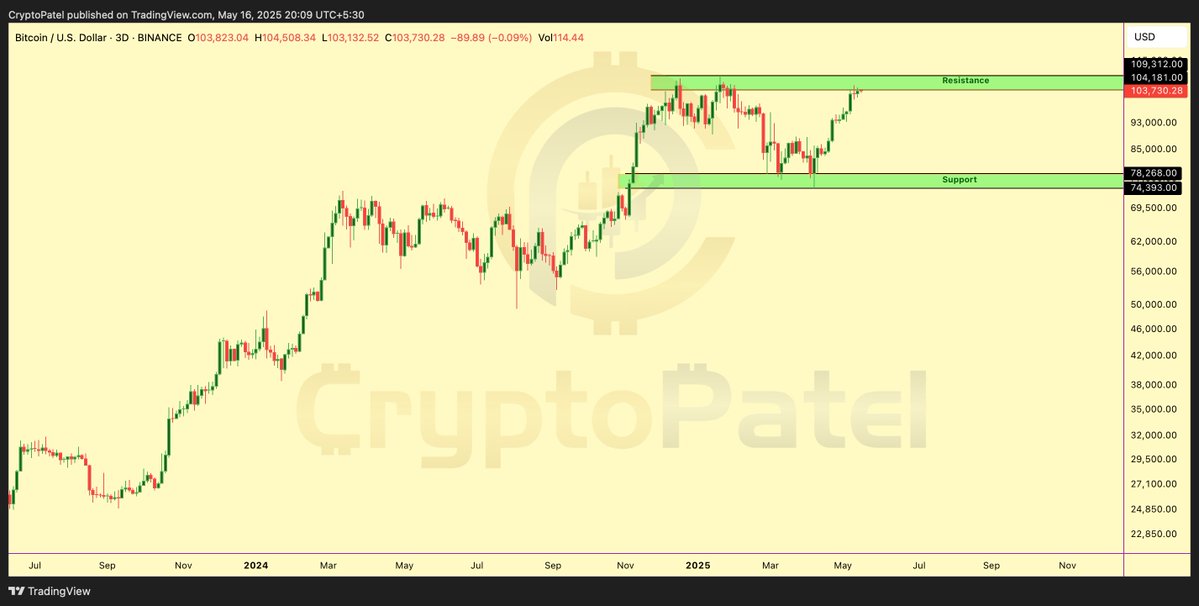 У пості X 16 травня криптовалюта Патель ділиться простим технічним аналізом руху цін на біткойн, підкреслюючи нинішній рівень підтримки та опору. За словами аналітика, останній приріст ціни Bitcoin показує, що активом зберігає критичний опір близько 106 500 доларів цін. Зокрема, ця смуга опору виявилася ефективною у спонуканнях цін на грудень та січень. Якщо Bitcoin Bulls зможе командувати достатньою попитом на ринку, щоб підкорити цей бар’єр цін, криптовалюта Патель проектує, що прем’єр -криптовалюта підтримає свій поточний підйом з початковою ціновою ціною, встановленою в розмірі 120 000 доларів.