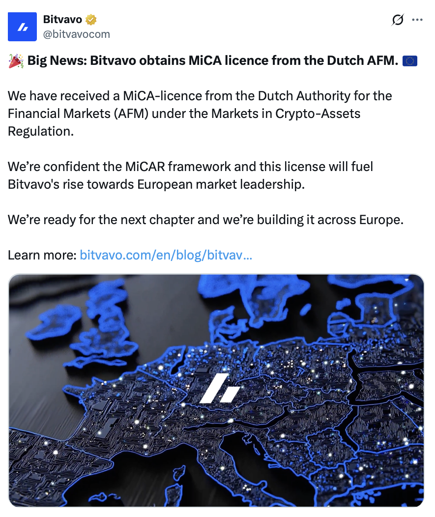Bitvavo став останньою біржею криптовалют, який отримав ліцензію на ринки криптовалютних наборів (MICA) Нідерландським органом з фінансових ринків (AFM), що дозволяє йому діяти по всій Європі відповідно до нової регуляторної бази.