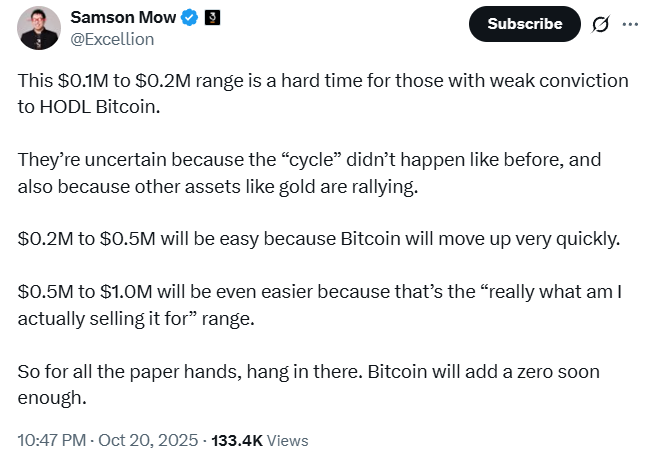 «Цей діапазон від 0,1 до 0,2 мільйона доларів — важкий час для тих, хто слабко переконаний у HODL біткойнах», — написав генеральний директор Jan3 Самсон Моу в дописі X у понеділок, додавши: