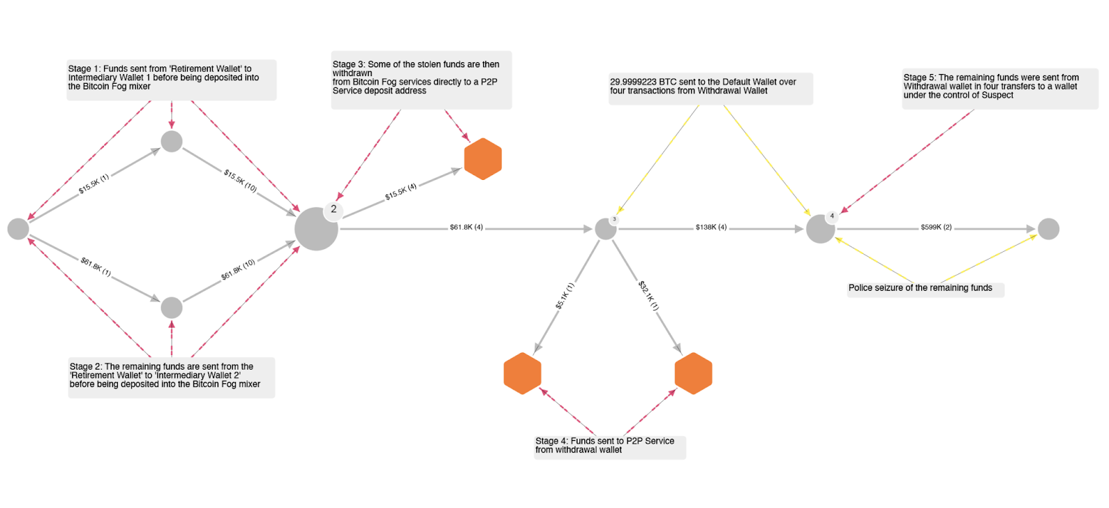 Chainalysis заявив, що його інструменти допомогли визначити, що деякі кошти були перетворені на готівку на обмінах або надягають криптовалютні дебетові картки, що дозволило їм легше витрачати.