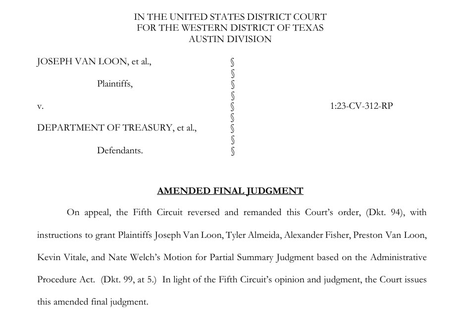 Суддя Федерального суду Остіна Роберт Пітман заявив у рішенні 28 квітня, що санкції OFAC на грошові кошти Торнадо були незаконними і що агентство “постійно вживалося від застосування” санкцій.