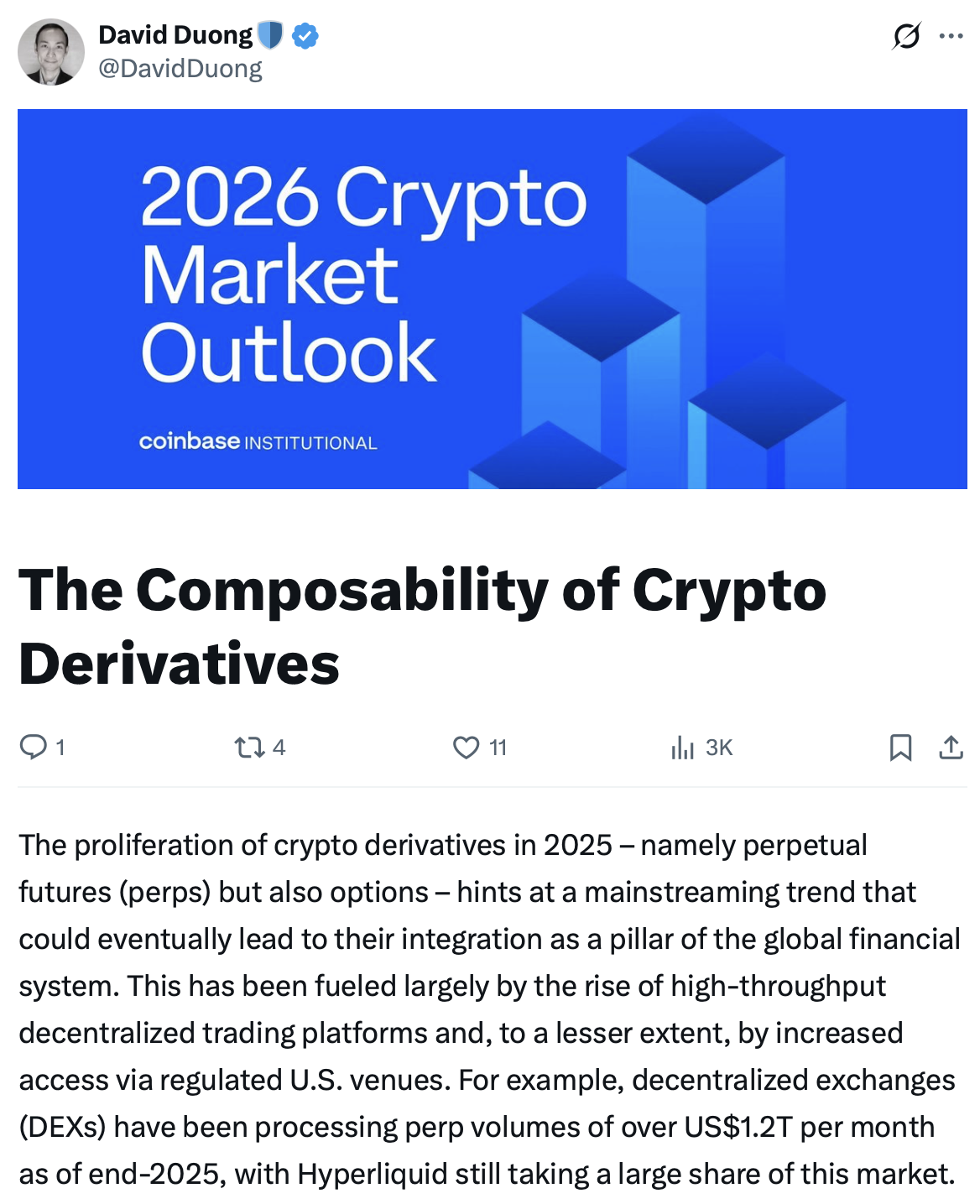 За словами дослідника Coinbase Девіда Дуонга, у 2025 році активність криптовалютних деривативів різко зросла, оскільки трейдери все частіше зверталися до безстрокових ф’ючерсів у мережі. Наприкінці року децентралізовані біржі щомісяця обробляли обсяги безстрокових ф’ючерсів на суму понад 1 трильйон доларів США, що підкреслює зростаючу роль ринків деривативів onchain.