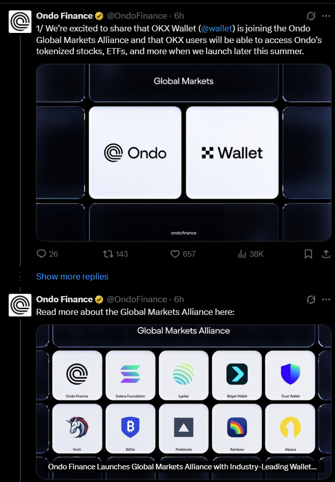 Ondo Finance посилила свій поштовх до фінансів Onchain, нещодавно оголосивши про утворення альянсу глобальних ринків з кількома фірмами криптовалют для сприяння прийняттю ринків капіталу на базі блокчейна. У четвер компанія оголосила, що Okx Wallet приєднався до альянсу.