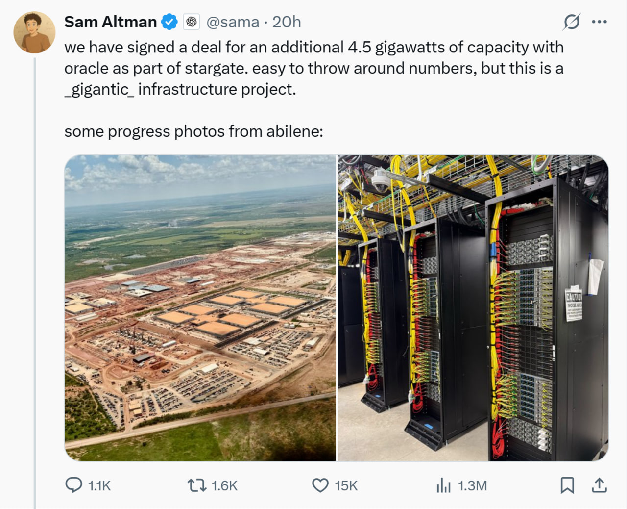 “Це гігантський проект інфраструктури”, – опублікував генеральний директор OpenAI Сем Альтман, поділившись зображеннями сайту Abilene. У попередній публікації він підтвердив, що понад 1 мільйон GPU буде в Інтернеті до кінця року, і пожартував: “Тепер вони краще працювати, щоб розібратися, як це 100 разів”.