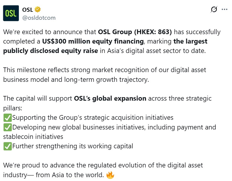 “Цей акціонерний капітал у розмірі 300 мільйонів доларів США знаменує важливу віху в нашій подорожі та відображає чітке засудження в стратегії та виконанні цифрових активів OSL”, – сказав Іван Вонг, головний фінансовий директор OSL Group.