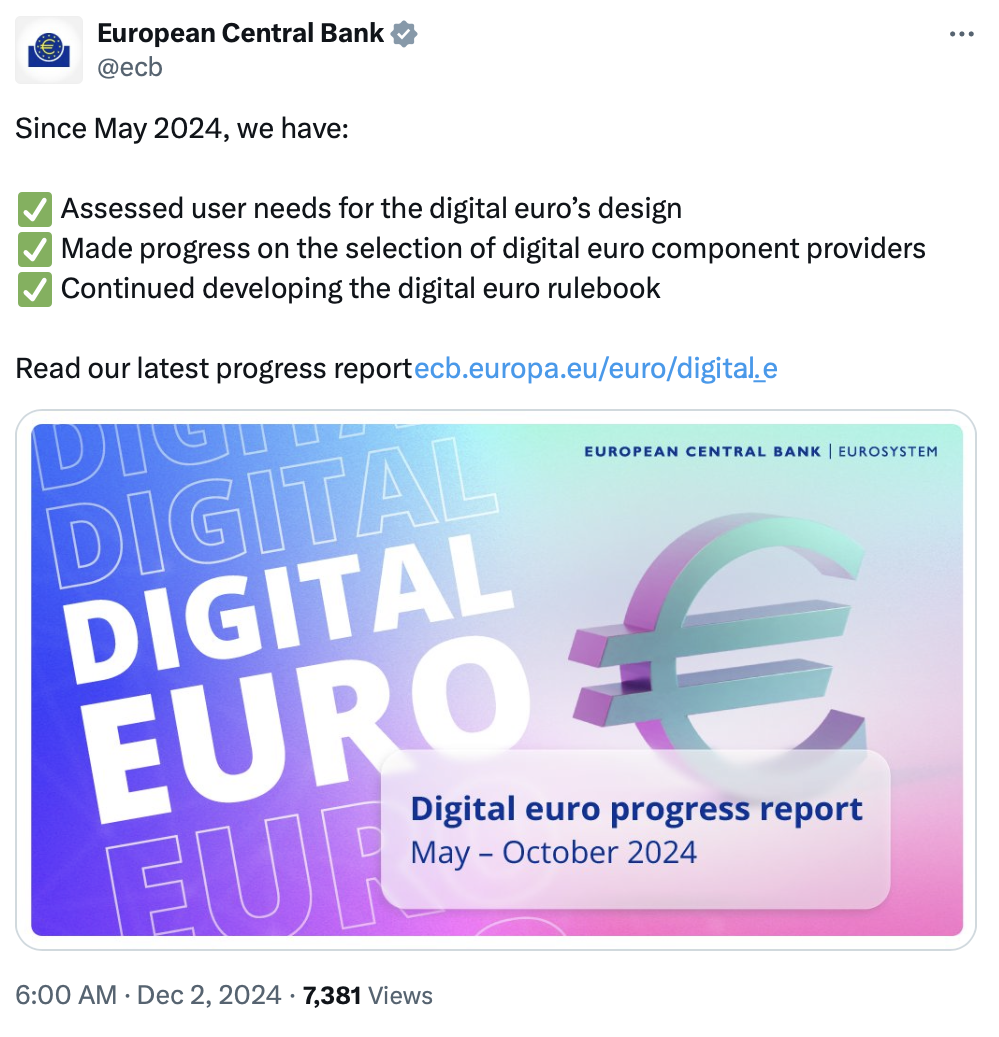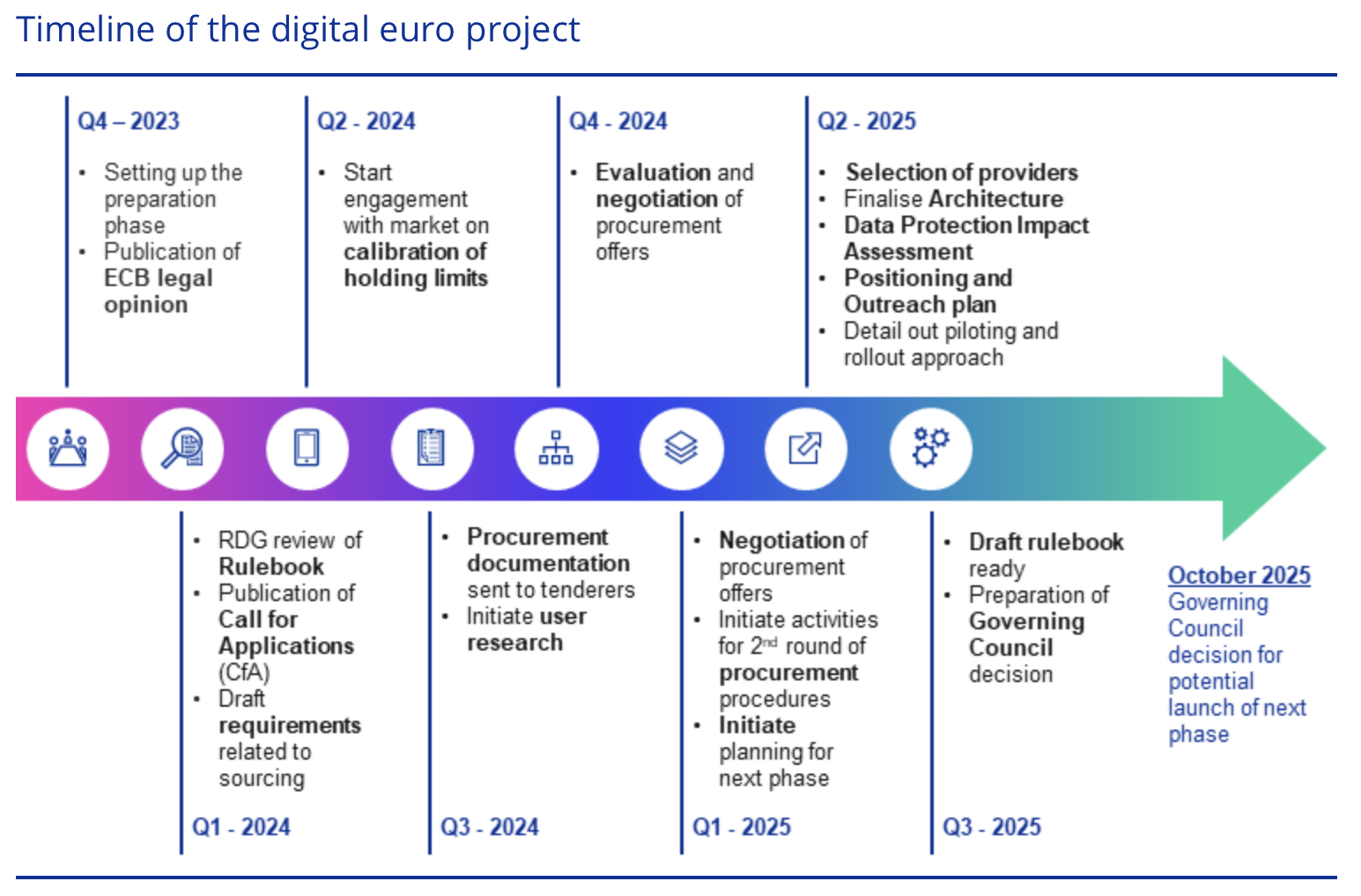 Триватиме відбір постачальників технічних послуг, а також спілкування з громадськістю та іншими зацікавленими сторонами. ЄЦБ опублікує наступний звіт про прогрес у цифровому євро у другому кварталі 2025 року. Рада керуючих ЄЦБ може прийняти рішення про запуск європейського CBDC у жовтні 2025 року.