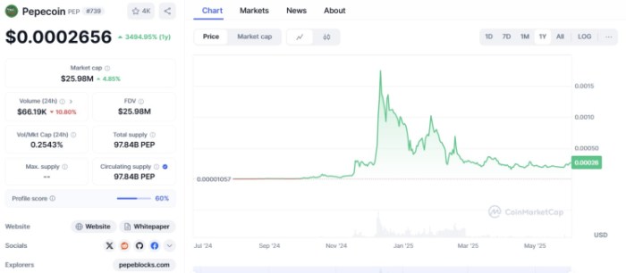З моменту запуску в січні 2024 року $PEP збільшився майже на 3300%. Це також одна з найпопулярніших криптовалют, що знаходяться в даний час, з більш ніж 34% прибутку протягом останніх семи днів. Наразі кожна монета доступна за низькою ціною 0,0002690 доларів.