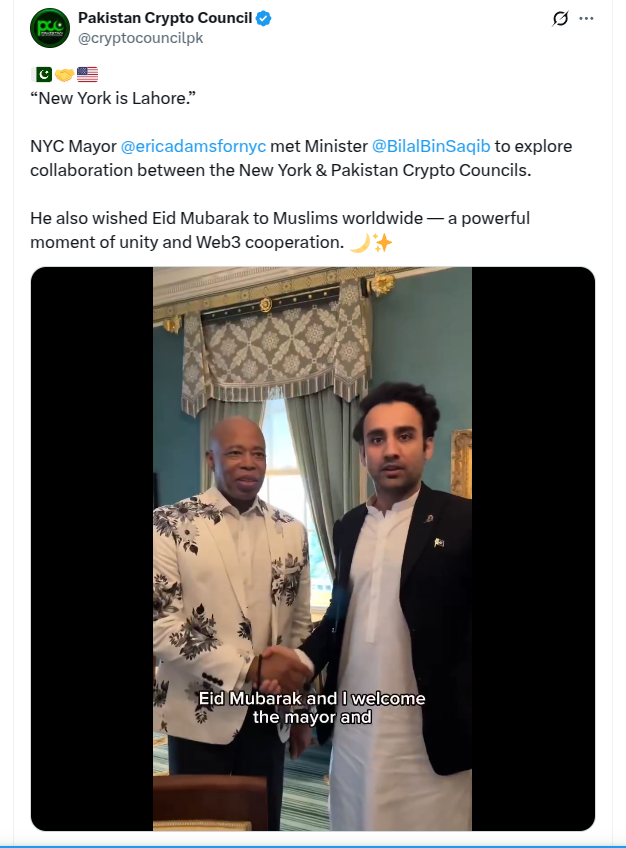 Пост 6 червня Ради криптовалют Пакистану показує, що Сакіб зустрівся з Брендоном Лутніком, головою та генеральним директором Cantor Fitzgerald, глобальною фірмою з фінансових послуг. Окреме відео, включене в окрему публікацію, показує, що він також зустрівся з мером Нью -Йорка Еріком Адамсом, який нещодавно заявив, що забезпечить запуску біткойн -облігації в місті. Повідомлення написано: