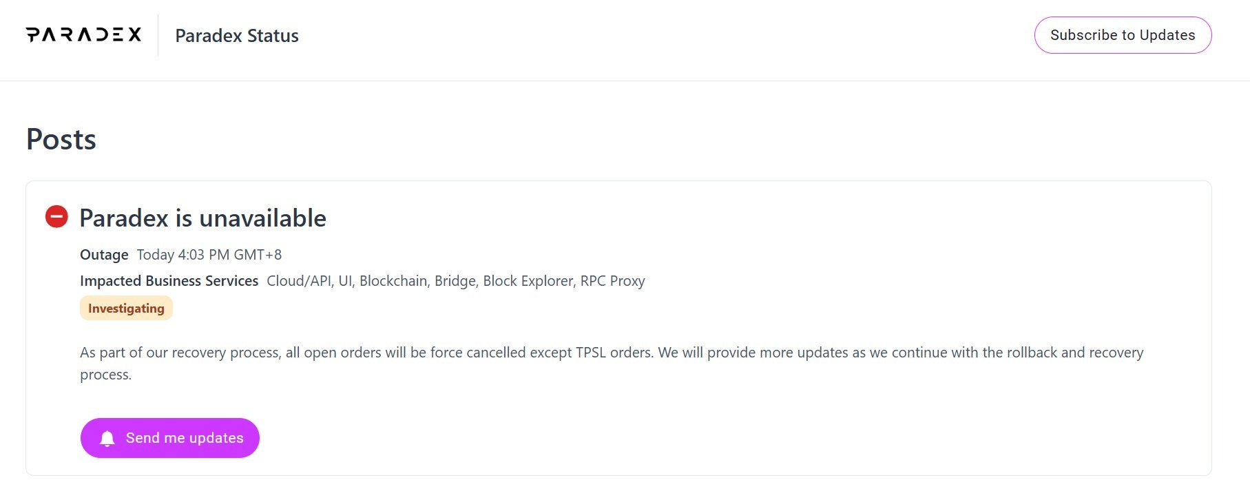На момент написання статті Paradex не розголошував причину збою та заявив, що оновлення будуть опубліковані на офіційній сторінці статусу та перевірених облікових записах.