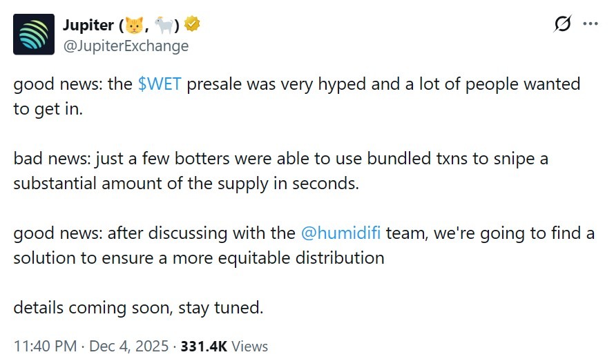 “Ми створюємо новий токен. Усі покупці Wetlist і стекерів JUP отримають пропорційний еірдроп. Снайпер не отримує лайна”, – написав HumidiFi. «У понеділок ми проведемо новий публічний продаж».