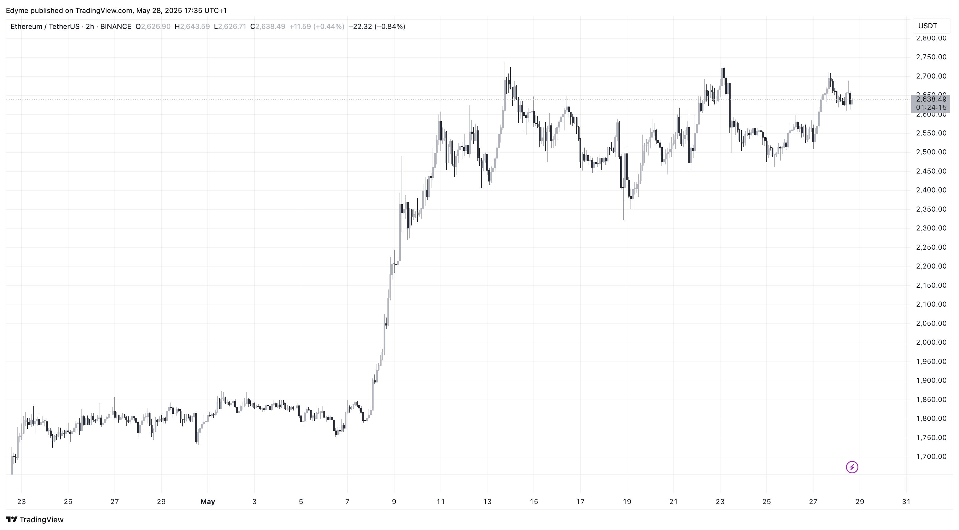 Ethereum (ETH), другий за величиною криптовалюта у світі, нещодавно зазнав значних коливань цін, торгуючи приблизно в 2633 доларів на момент написання. Актив зареєстрував легке зниження на 1,2% за останні 24 години, трохи відступивши після того, як минулого тижня перевершивши позначку в розмірі 2700 доларів.