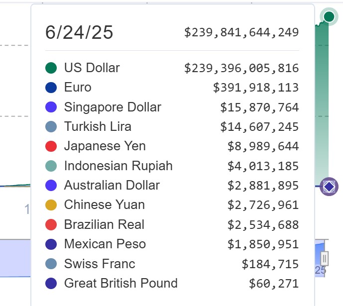 Дані з реального активу (RWA) Tokenization Tracker RWA. XYZ показують, що StableCoins має ринкову капіталізацію понад 239 мільярдів доларів. Дані також показують, що 99% випущених стабільців прив’язані до долара США.