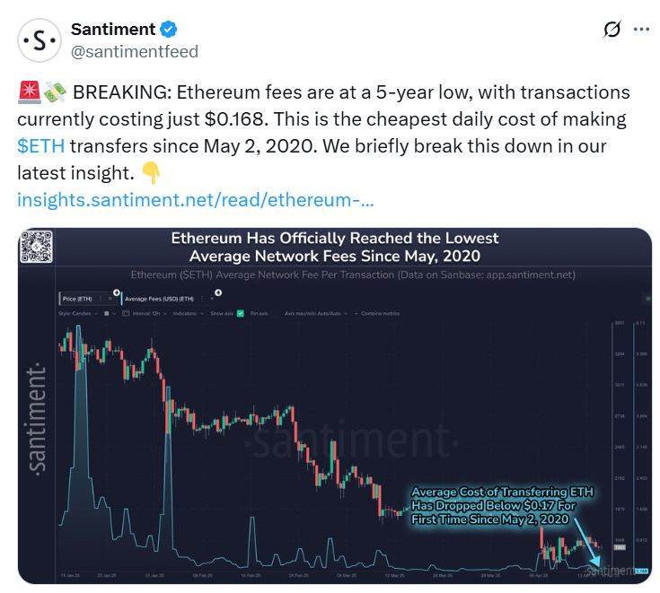 Трансакційні витрати на мережу Ethereum знизилися до найнижчого рівня за п’ять років, оскільки кількість активності на блокчейні знаходиться в затишшю, згідно з платформою Onchain Analytics Santiment.