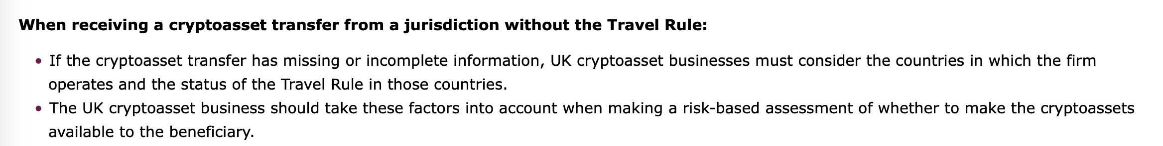 Під час угод з VASP в юрисдикціях, які не запровадили Правила подорожей, компанія, що відправляє британську компанію, повинна вжити заходів, щоб визначити, чи здатний одержувач будь-яким чином отримати необхідну інформацію, а також збирати та зберігати інформацію в будь-якому випадку. Якщо британський криптовалютний бізнес є одержувачем переказу, він повинен діяти на розсуд: