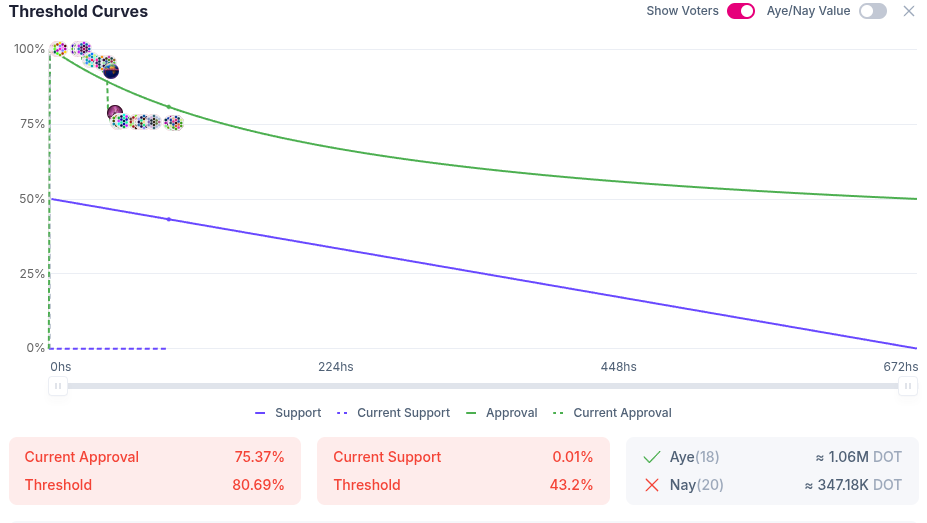 На момент написання понад три чверті голосів було подано на користь пропозиції. Тим не менш, до того, як закриється голосування, потрібно пройти понад 24 дні, і поки що більше 5,6 мільйонів доларів DOT було використано для подання голосів – понад 1,4 мільйона крапки за ціною близько 3,90 доларів.