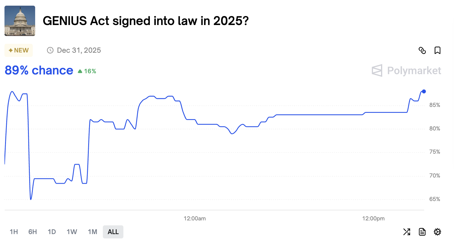 Станом на четвер, онлайн-платформа Plymarket Plymarket показує 89% шансів на керівництво та встановлення національних інновацій для американських стабілій, або закону про геній, прийнявши Сенат США та Палату представників та підписаний законом Президентом до 2026 року. Ставка на полімаркет, здавалося, була розпочата приблизно 18 годин після прийняття законопроекту в сенаті у 68-30 голосах у вівторок.