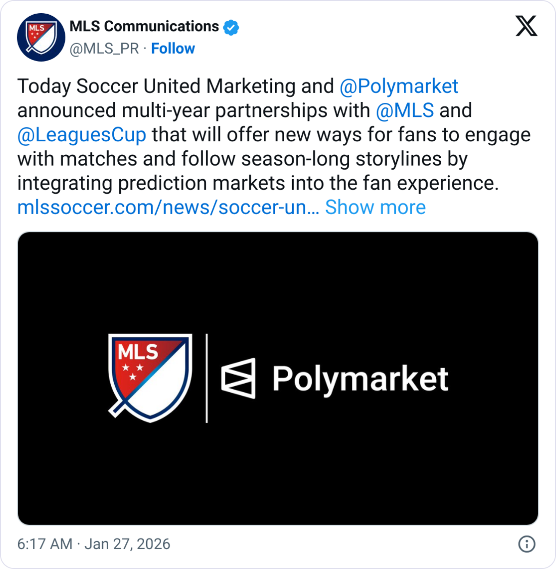 MLS і Polymarket заявили, що угода включає гарантії, «створені для захисту цілісності матчів MLS і Кубка ліг», включаючи незалежний моніторинг торгової діяльності.