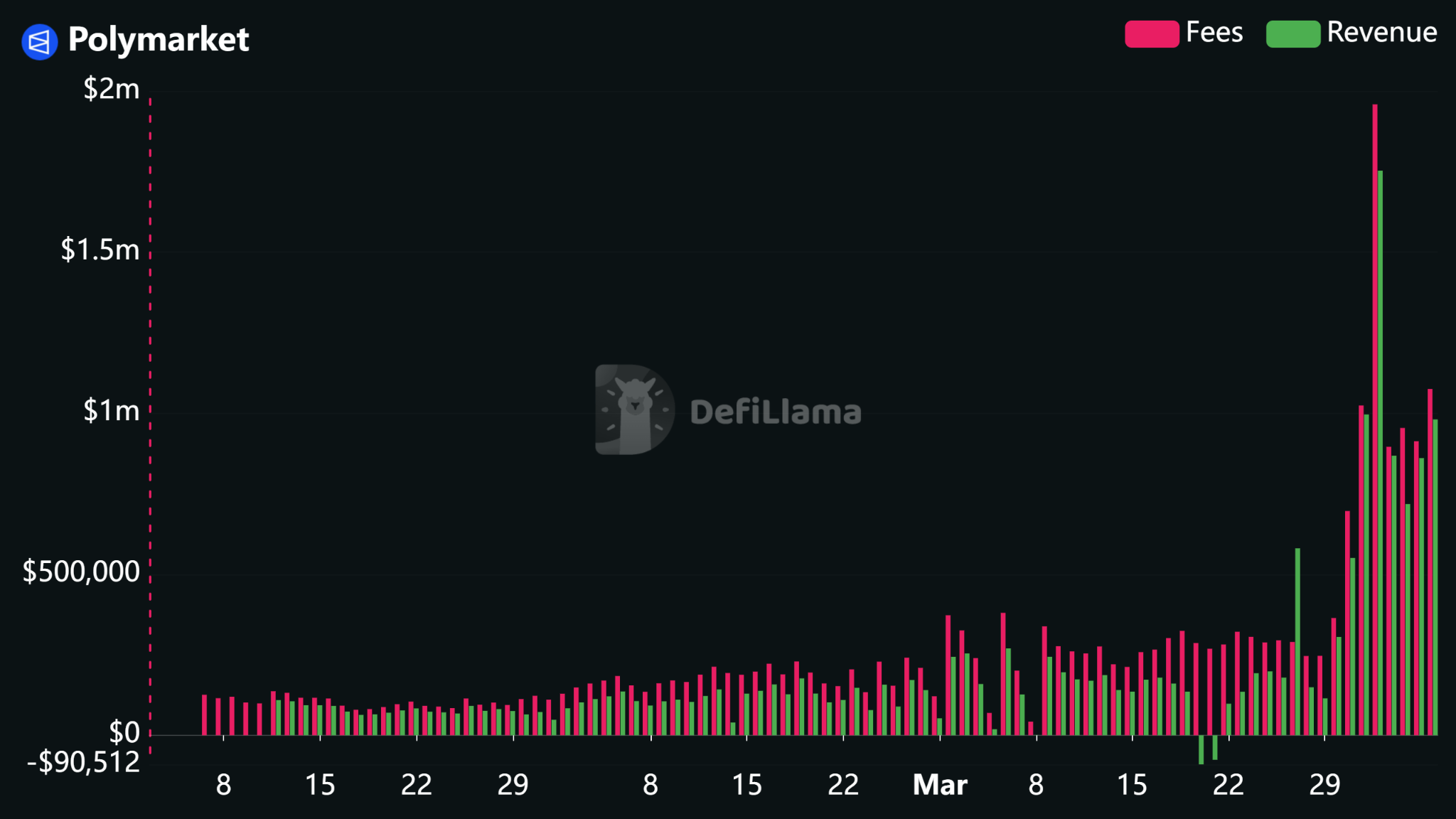 Інтерес до прогнозних ринків продовжує зростати, і користувачі все частіше звертаються до цих платформ для торгівлі на реальних результатах, пов’язаних з політикою, ринками та політикою. Галузеві дані показують, що дохід від комісії Polymarket зріс за останні тижні після того, як платформа розширила комісію за торгівлю.