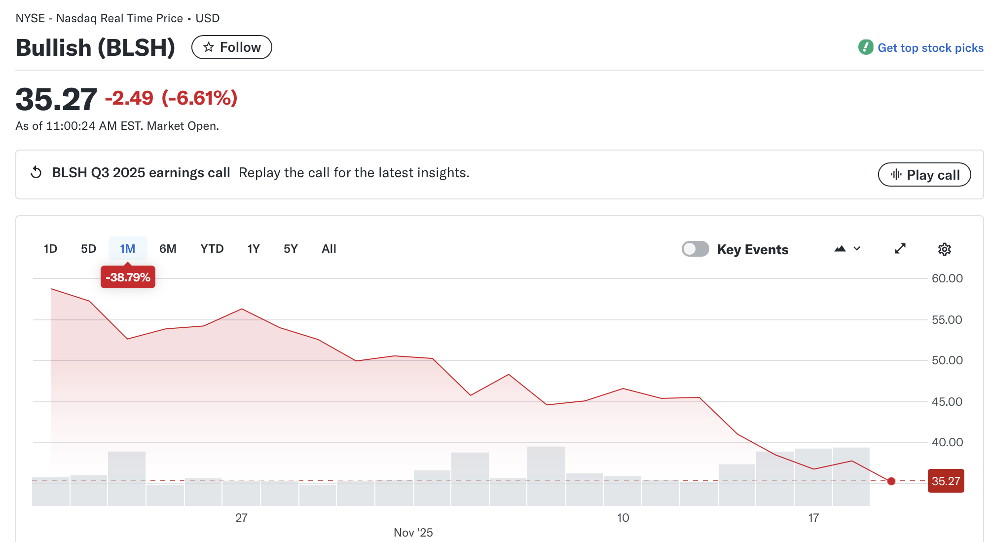Курс акцій Bullish не сприйняв цю новину позитивно. Він знизився на понад 6% у перші години торгів і продовжує падати майже на 40% за останній місяць.