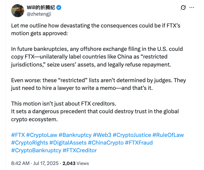 “Цей рух не лише щодо кредиторів FTX. Він встановлює небезпечний прецедент, який може знищити довіру до глобальної екосистеми криптовалют”, – сказав Вейвей Джі, кредитор, відомий як Віл на X.