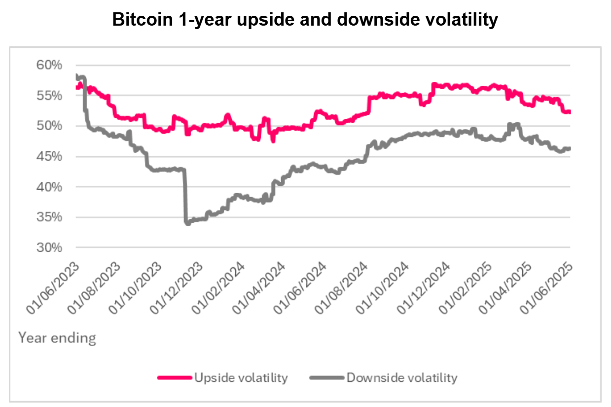 Sygnum також позначив покращення профілю мінливості Bitcoin. Протягом останніх трьох років волатильність догори випереджала мінливість, ознака дозрівання ринку та зростаючої інституційної участі.