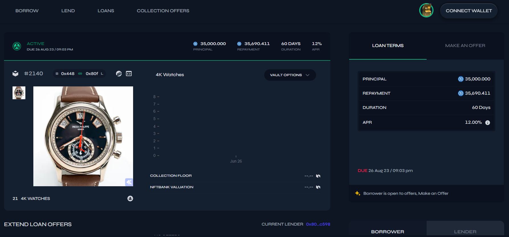 Тоді NFT було включено до списку протоколу кредитування DeFi Arcade. Після перерахування об’єкта кредитори надавали свої пропозиції позичальнику. Потім користувач прийняв найкращу пропозицію позики, яку міг знайти. Після цього NFT було відправлено на депозитний гаманець, де він залишався до повної виплати кредиту або якщо позичальник не виконає зобов’язання. Якщо позичальник не сплачує позику, NFT буде присуджено позикодавцю. Потім його можна спалити, щоб отримати годинник.