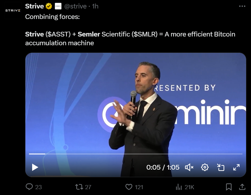 Поряд із злиттям, Strive розкрив, що він придбав 5 816 біткойна (BTC) за близько 675 мільйонів доларів, збільшивши його загальну кількість акцій до 5 886 BTC. Перед придбанням Strive був відносно незначним гравцем у просторі казначейства Bitcoin, лише 70 BTC на своїх книгах.