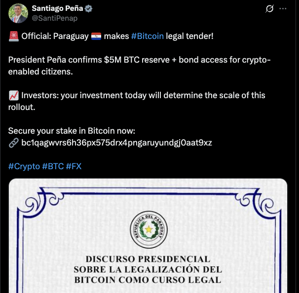 Пост був зроблений через кілька хвилин після того, як особистий рахунок Пеньї на X оголосив (англійською мовою), що Парагвай зробив юридичний тендер Bitcoin (BTC) та встановив резерв BTC на суму 5 мільйонів доларів, також надавши адресу гаманця для інвесторів “забезпечити [свою частку].