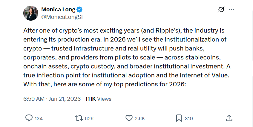 Приблизно 250 найбільших корпорацій США будуть або тримати криптовалюту, або використовувати фінансові інструменти на основі блокчейну до кінця 2026 року, каже президент Ripple Моніка Лонг.