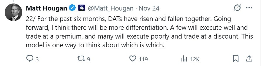 Головний інвестиційний директор Bitwise Метт Хоуган сказав, що останні шість місяців показали, що DAT мають тенденцію рухатися взаємно, зростаючи та падають разом.