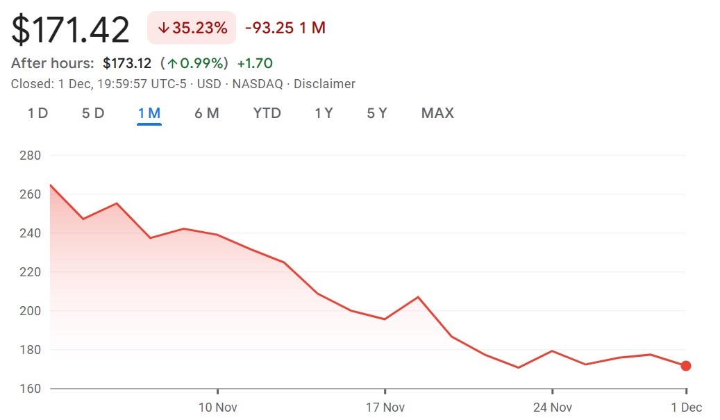Дані Google Finance показали, що Strategy, найбільший DAT у секторі, впав на 35,23% за місяць, впавши з $264,67 3 листопада до $171,42 на момент написання статті.