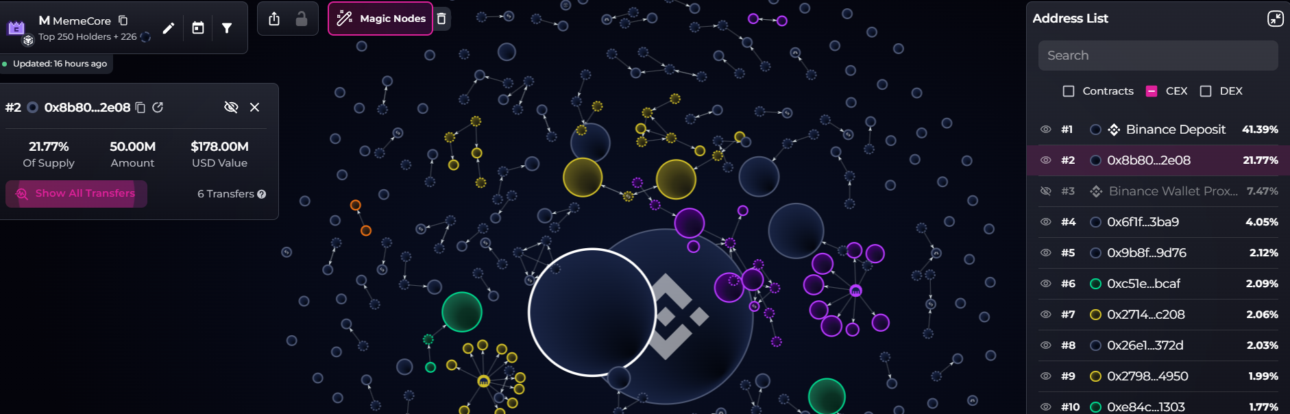 Другий за величиною власник, гаманець «0x8b8», тримав 50 мільйонів токенів M наразі вартістю 178 мільйонів доларів, що становить 21,77% пропозиції, згідно з платформою візуалізації даних блокчейну Bubblemaps, яка вказала адресу Binance Deposit як найбільшого власника з 41,3% пропозиції.