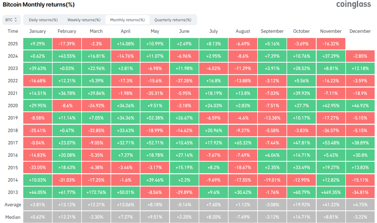 Відтік ETF продовжував зростати, незважаючи на те, що інвестори, виходячи з історичних даних, очікували зростання біткойна протягом місяця. Згідно з даними CoinGlass, листопад є найкращим місяцем для історичної прибутковості біткойна: BTC у середньому зріс за місяць на 41,22%.