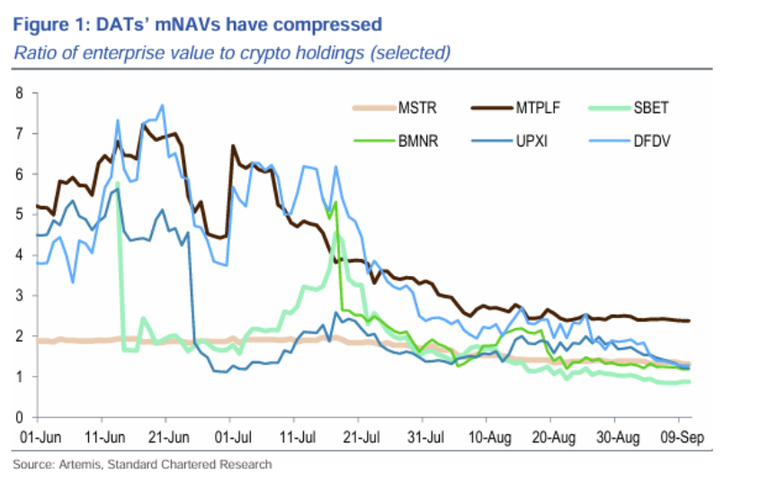 Аналітики Standard Chartered попередили, що фінансові компанії цифрових активів можуть зіткнутися з оціночним стисненням як цінності чистих активів ринку (MNAVS), які порівнюють вартість підприємства компанії з її криптовалютами, продовжують знижуватися.