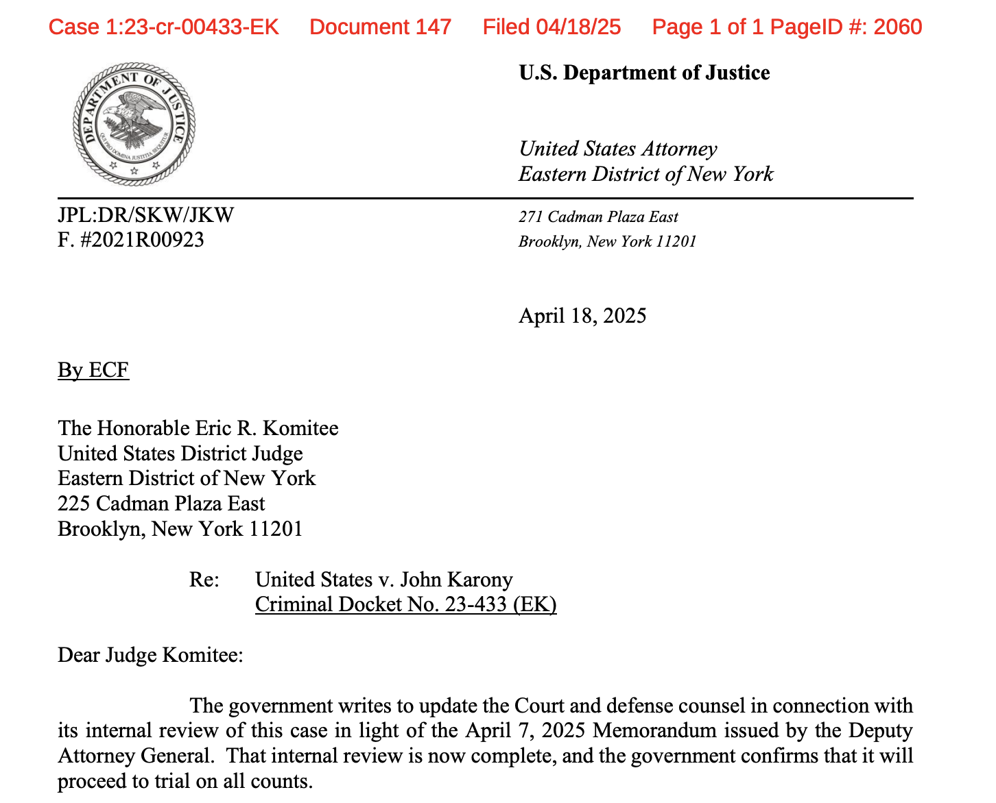 У поданні 18 квітня в окружному суді США в Східному окрузі Нью -Йорка, прокурор США в Едні Джон Дарем заявив, що його офіс переглянув меморібство DOJ 7 квітня, виданий заступником генерального прокурора Тодда Бланш і мав намір продовжити судовий процес проти Кароні.
