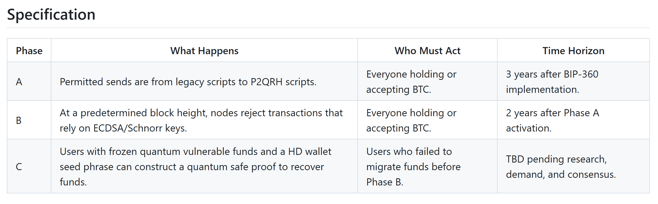 Приблизно через п’ять років після цієї зміни план піде далі, унеможливлюючи витратити будь -який біткойн, що зберігається в тих старих, вразливих адресах, по суті заморозити ці монети.