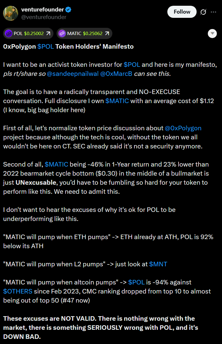 Пропозиція слідує за широко розповсюдженим маніфестом, розміщеним VentureFounder на X, який набрав понад 25 000 переглядів. У цій публікації інвестор описав 46% зниження POL за останній рік, а його поточний рівень торгівлі нижче 2022 р. МАРКЕТ-МАРКЕТ-МАРКЕТ, як “невиправданий” під час того, що багато хто вважає ринок криптовалюти на чолі з біткойном (BTC) та ефіром.