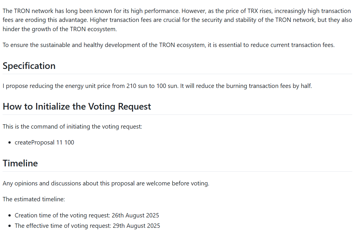 Пропозиція під назвою “Зниження плати за транзакцію” (випуск № 789) була подана 8 серпня користувачем Github Grothendi у репозиторії пропозицій TRON.
