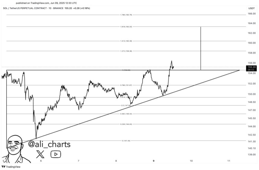 Аналітик криптовалюти Алі Мартінес підкреслив 3-денну формацію в діаграмі Солани, що пропонує потенційний 6% перейти до нещодавно втраченого рівня підтримки. Згідно з повідомленням, криптовалюта вибухнула з формації трикутника в понеділок після повернення площі 155 доларів.