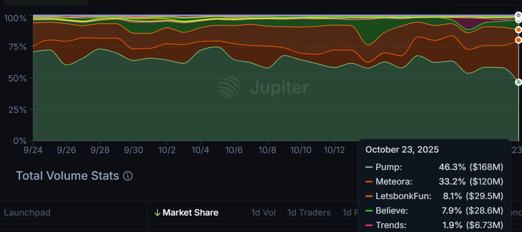 Згідно з даними Jupiter, Pump.fun залишається найбільшим майданчиком для запуску мемкойнів на Solana, на нього припадає приблизно 44% частки ринку. Однак цей показник знизився з піку близько 75%.
