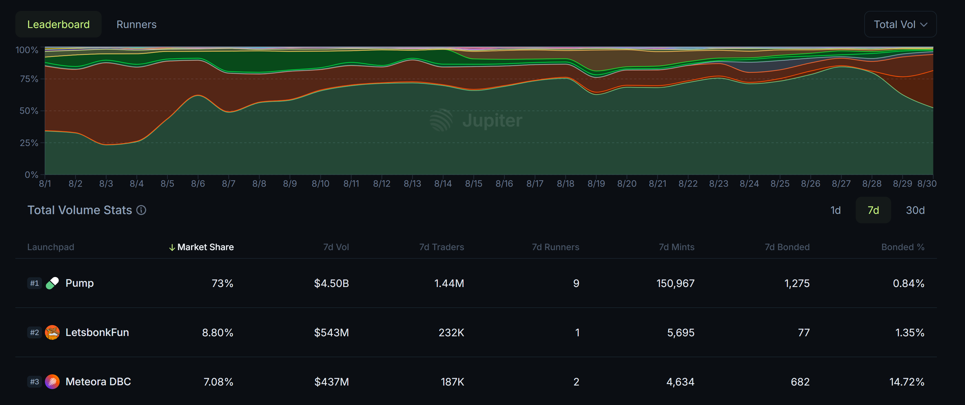 Згідно з агрегатором децентралізованої біржі (DEX) Юпітера, домінування Летсбонка тривало протягом усього липня, набираючи більшу частку ринку, ніж насос.