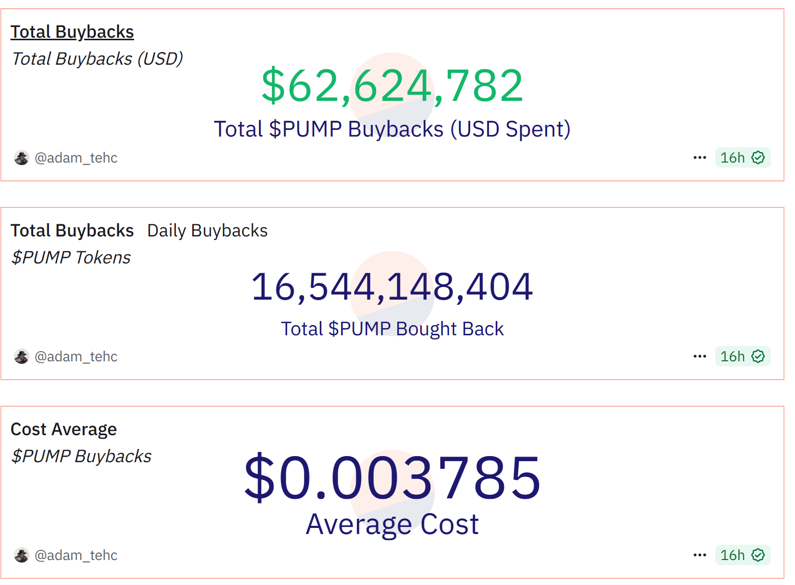 Pump.fun витратив понад 62,6 мільйонів доларів, що викуповує свій вихідний токен, насос, згідно з даними Dune Analytics. Викуп просочило понад 16,5 мільярдів токенів за середню вартість 0,003785 доларів, оскільки платформа, як видається, стабілізує цінові дії та зниження тиску продажу.