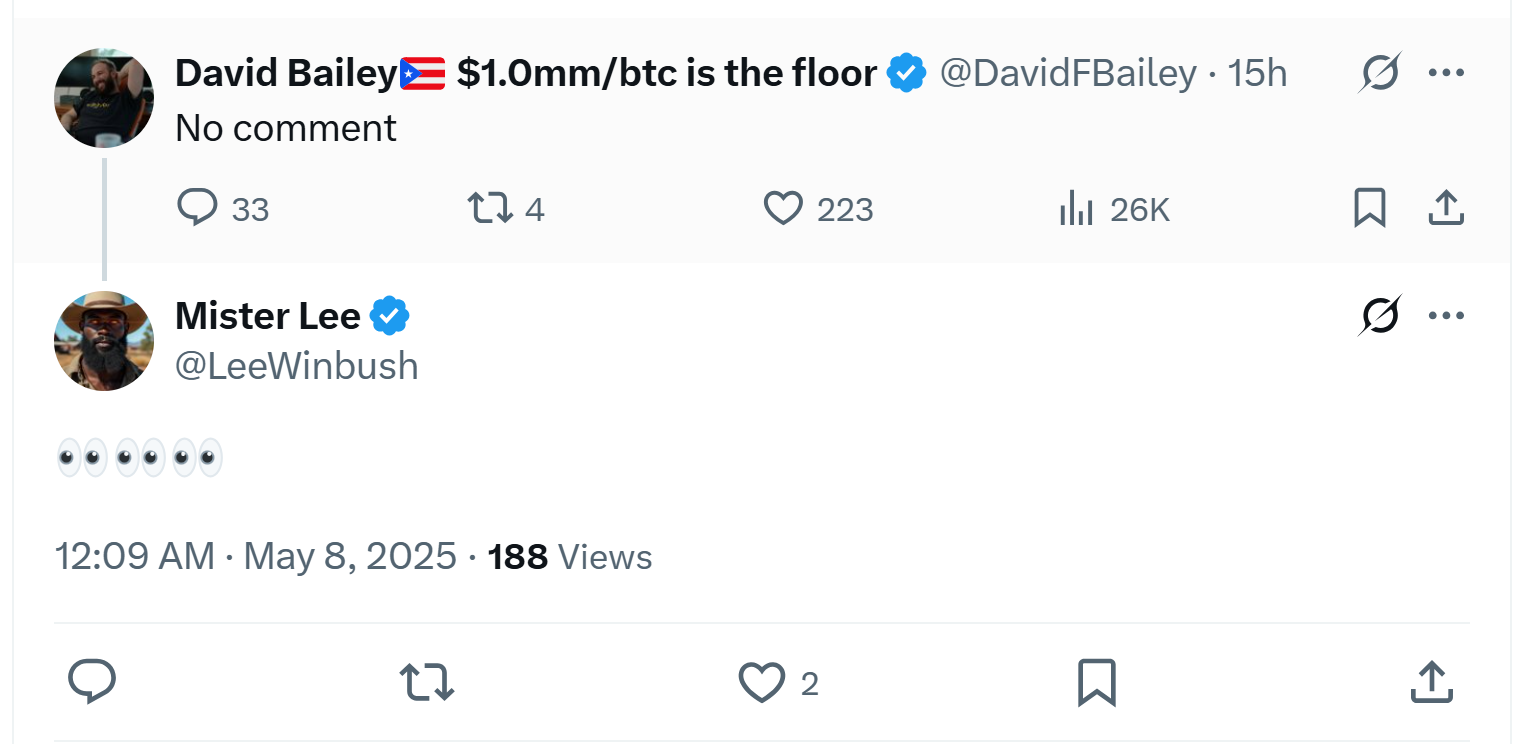 “Немає коментарів”, – написав Бейлі у публікації 7 травня на X, мабуть, у відповідь на новини про свою інвестиційну фірму Bitcoin (BTC).