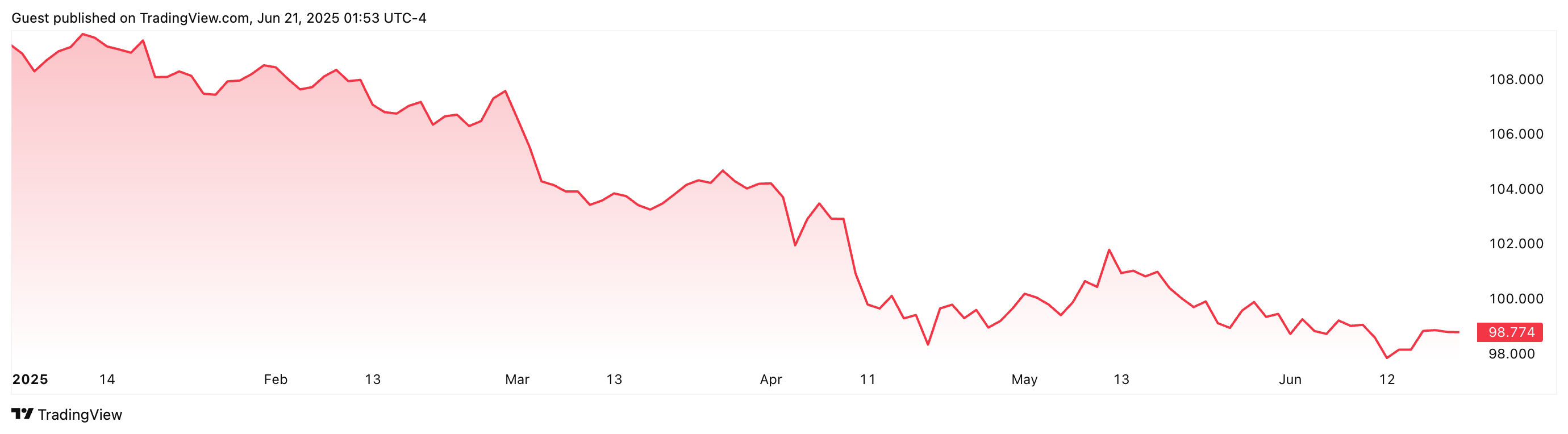 “Коли долар розбивається навіть сьогодні, він починає припустити, що це може перейти в Q2 2026”, – сказав він. Починаючи з 1 січня, індекс долара США (DXY) знизився на 8,99%, що на момент публікації становить 98,77, згідно з даними TradingView. Біткойн і DXY обернено співвідносяться.