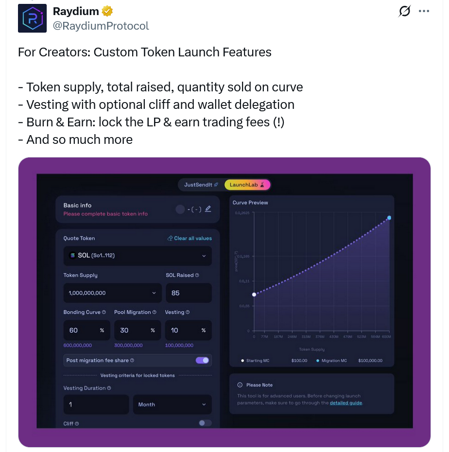 Raydium заявив, що LaunchLab надає любителям Memecoin налаштованих кривих зв’язків та без міграційних зборів, тоді як токени, які збирають 85 Solana (Sol) – на даний момент вартістю 11 150 доларів – миттєво перейдуть до AMM Raydium.