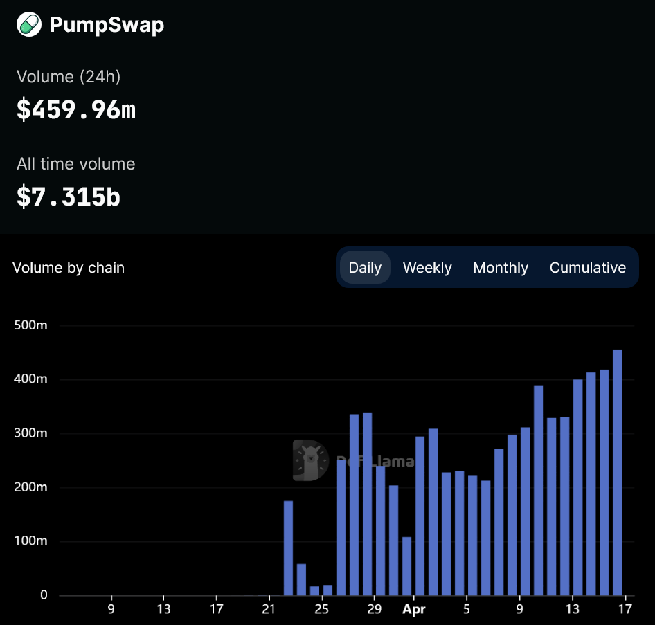 Зараз Pumpswap обробляв обсяг на суму 7,3 мільярда доларів з моменту запуску 22 березня, показують дані Defillama.