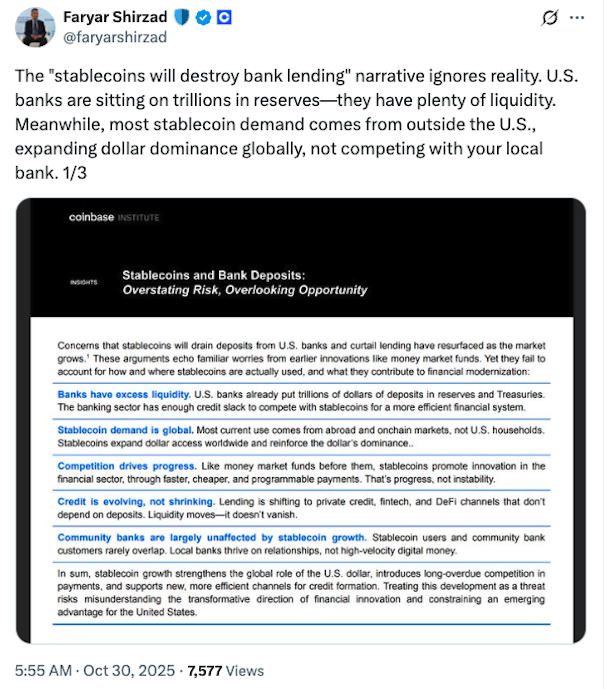 «Наратив «стейблкоїни знищить банківське кредитування» ігнорує реальність», — заявив у середу керівник політики Coinbase Фар’яр Ширзад.