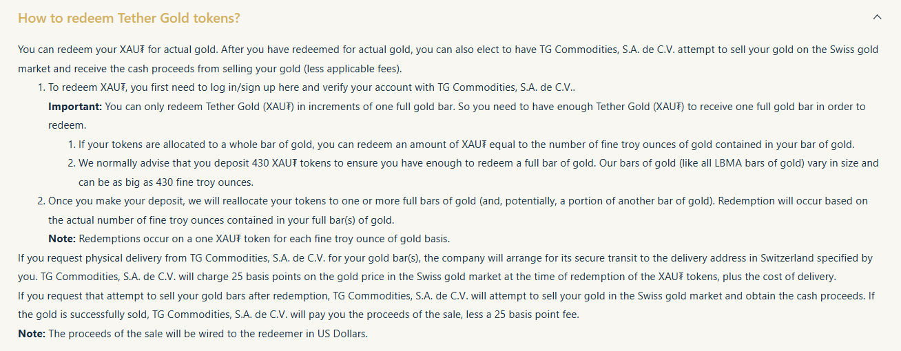 В даний час токени Tether’s Tether підлягають викупу фізичному золоту, але користувачі повинні мати щонайменше 430 xaut, щоб викупити одну повну золоту смугу, повідомляє Tether.