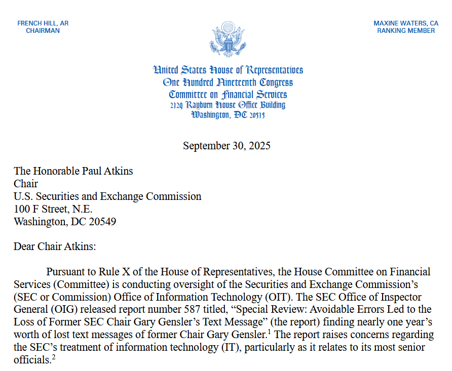 Республіканці Палати США повідомили голові комісії з цінних паперів та бірж Пол Аткінс, що вони розслідують втрату текстових повідомлень від колишнього голови SEC Гері Генслера, коли він керував агентством.